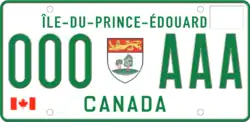 | 2022–present | Green letters on white baseplate; 'PRINCE EDWARD ISLAND' screened at top. Provincial crest separator in centre and small Canadian state flag in bottom left. | CANADA | 123★ABC | Default version for Anglophone Prince Edward Islanders.[3] | |