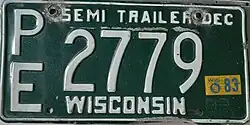 | Wisconsin | Private semi-trailer | Embossed white serial on green plate with border line; "WISCONSIN" at bottom, "SEMI TRAILER" at top; "DEC" at top right, debossed "82" at bottom right | P/E12345 | P/E 1 to approximately P/E22000 | Five year semi-trailer license plates issued in 1982; revalidated for 1987 with blue on silver stickers. |