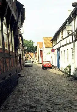 Ribe (Danish pronunciation: [ˈʁiːpə]) is a town in south-west Jutland, Denmark, with a population of 8,367 (2025).[2][3] It is the seat of the Diocese of Ribe. Until 1 January 2007, Ribe was the seat of both a surrounding municipality and county. It is now part of the enlarged Esbjerg Municipality in the Region of Southern Denmark. It is the oldest town in Denmark.[4]