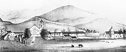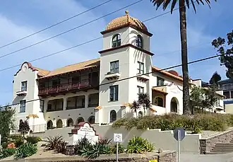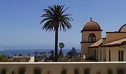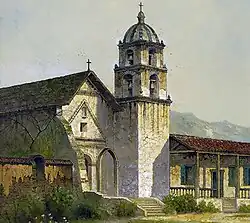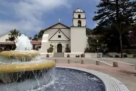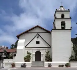 In 1769, the Spanish Portolà expedition, first recorded European visitors to inland areas of California, came down the Santa Clara River Valley from the previous night's encampment near today's Saticoy and camped near the outlet of the Ventura River on August 14. Fray Juan Crespi, a Franciscan missionary traveling with the expedition, noted that "we saw a regular town, the most populous and best laid-out of all that we had seen on the journey up to the present time."[20] Archaeological records found that the Chumash village they encountered was settled sometime around AD 1000. Junípero Serra, first leader of the Franciscans in California, founded Mission San Buenaventura in 1782 as his ninth and last mission established near the Chumash village as part of Spain's colonization of Alta California.[21] The mission was named for St. Bonaventure, a 13th-century Franciscan saint and a Doctor of the Church. San Miguel Chapel was the first outpost and center of operations while the first Mission San Buenaventura was being constructed. The first mission burned in 1801 and a replacement building of brick and stone was completed in 1809. The bell tower and facade of the new mission was destroyed by an 1812 earthquake.[22][23] The Mission was rebuilt and functions as a parish church.