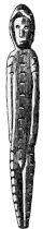 Four of them are made of ivory and one of them is made of serpentine.[1] One of the figurines (pictured) made of ivory depicts a shrouded person. A similar shrouded figurine has been found from Mal'ta. Carvings on the figurine might represent decorated clothes. The figurine is partially sexually ambiguous due to lack of breasts, but it has an emphasized pubic triangle and vaginal area.[5]