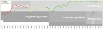 The first season under the new name was in 2003–04, which ended with an eighth place, the next season the team was relegated to the 2nd Bundesliga in 12th place but gained direct promotion in the following 2005–06 season. After a fifth place in 2009–10, Wolfsburg grew up one year later, contending for the title and managed to be runner-up in 2011–12.