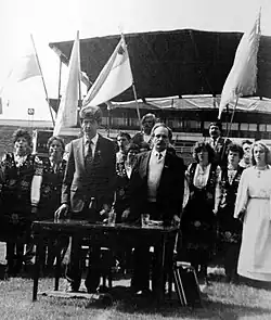 On 8 September 1989, the People's Movement of Ukraine (Ukrainian: Народний рух України, romanized: Narodnyi rukh Ukrainy, abbreviated as "Rukh") was established on the basis of the programme of the Writers' Union.[91] Fully named as the "People's Movement of Ukraine for Perestroika", its first leader was poet Ivan Drach. Despite this, however, Chornovil was the de facto leader of the party and organised its establishment, according to historian Roman Hrytskiv. Rukh's founding meeting was the largest gathering of Ukrainian anti-communists ever,[92] comprising around 1,100 delegates, 130 journalists, representatives of the Polish government and the Solidarity trade union, members of the Ukrainian diaspora in Latvia and Lithuania, and a select few members of the Communist Party (among them Leonid Kravchuk, Chornovil's future political rival).[93] Coincidentally, Shcherbytsky was forced to resign the same month, a combination of pressure from the miners' strikes[88] and from Gorbachev, whose reforms were at odds with Shcherbytsky's status as one of the few remaining conservatives to hold high office.[94]
