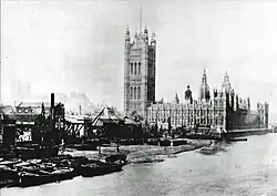 A private scheme to rebuild the area south of the gardens was discussed in Parliament in 1898 in the Victoria Embankment extension and St John's Improvement Bill,[4] and was rejected because it did not include extending the Gardens.[5] London County Council then brought forward its own scheme for widening Millbank, extending the Thames embankment and enlarging the open space southwards to Lambeth Bridge. The Commissioners of Works were expected to give up a small part of the existing gardens for the road widening, and, in order to honour the promise to Smith, insisted that it be expressly provided in the act authorising the scheme that the new land between Millbank and the river be laid out as a garden.[6] Consequently the London County Council (Improvements) Act 1900, which authorised the scheme, provided that the new land between Millbank and the Thames should be "laid out and maintained ... for use as a garden open to the public and as an integral part of the existing Victoria Tower Garden".[7] The new land was laid out as a garden in 1913-14 and opened to the public on 30 June 1914.[8]