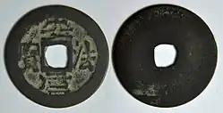 The first Vietnamese coins were cast under the rule of the Đinh dynasty (968–981) with the introduction of the Thái Bình Hưng Bảo (太平興寶) under Đinh Bộ Lĩnh.[16] Likewise the only inscription cast during the Early Lê dynasty period bore the inscription Thiên Phúc Trấn Bảo (天福鎮寶).[15][17] However, for the next two centuries coins would remain a rarity in the daily lives of the common people, as bartering would remain the dominant means of exchange under both the Đinh and Early Lê dynasties.[18]