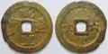 The first cash coins of the Lý dynasty produced during the reign of Emperor Lý Thái Tổ were the Thuận Thiên Đại Bảo (順天大寶), these were among the largest early Vietnamese cash coins with a diameter of 25.5 millimeters.[19][20] All known variants of this cash coin feature the Chinese character Nguyệt (月) on the top of their reverse sides.[19]