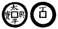 ![]() First and last Vietnamese cash coins: Thái Bình Hưng Bảo (太平興寶) issued during the Đinh dynasty (970–980). Bảo Đại Thông Bảo (保大通寶) issued under Bảo Đại (1925–1945). | |