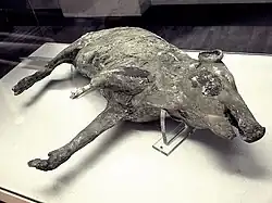 Large quantities of pottery and farm implements were found. Plaster casts of the original entrance doors were made from the hollow spaces left. A plaster cast of a pig found here and killed in the catastrophe was also made.