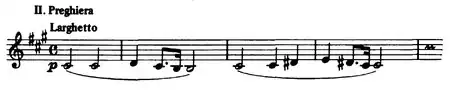 The second movement, Preghiera (Prayer), is a short lyrical interlude in A major, with the orchestra woodwinds and horns given much prominence.[3] It leads into the concluding Rondo, a colourful and vivacious piece with a contrasting episode in B major and demanding bravura playing, but without the first movement's extreme pyrotechnics (suggesting that it was composed earlier).