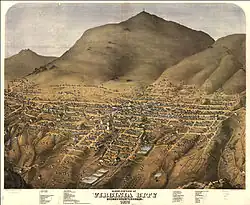 Peter O'Riley and Patrick McLaughlin are credited with the discovery of the Comstock Lode.[8][9] Henry T. P. Comstock's name was associated with the discovery through his own machinations. According to folklore, James Fennimore, nicknamed Old Virginny Finney, christened the town when he tripped and broke a bottle of whiskey at a saloon entrance in the northern section of Gold Hill, soon to become Virginia City.[10]