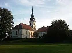 The parish church in the settlement is dedicated to Saint Margaret and was first mentioned in documents dating to 1118. It used to have a defensive wall around it to protect the population from Ottoman raids, but this was demolished in 1871. The church was damaged in the 1895 Ljubljana earthquake and was rebuilt in entirety from 1896 until 1900 based on plans by the architect Raimund Jeblinger.[6][7]