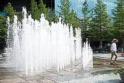 The company's first major project came in 1986 when it collaborated with the firm of I. M. Pei[7] as well as landscape architects Dan Kiley and Peter Ker Walker to create the waterscape of Fountain Place (at Allied Bank Tower) in Dallas, Texas.[3] The project showed the first use of WET's patented open-jointed paving in a fountain where shots of water appear from the openings in the plaza's surface.[4][8]