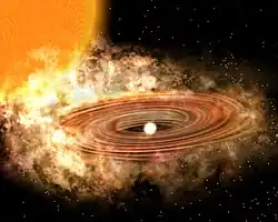 WZ Sagittae (WZ Sge) is a dwarf nova cataclysmic star system in the constellation Sagitta. It consists of a white dwarf primary being orbited by a low mass companion. The white dwarf is about 0.85 solar masses while the companion is only 0.08 solar masses. This implies that the companion is a spectral class L2 star, although this has yet to be confirmed.[10] The distance to this system has been determined by parallax, yielding a distance of 45.2 parsecs.[13][4]