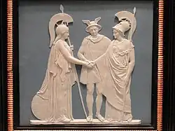 On recommendation by Sir Goscombe John, Percy Metcalfe was eventually tasked to model the coin. Metcalfe had previously designed a series of rejected models for the 1933 issue.[8] In July 1934, six weeks after Berry's design was rejected, Metcalfe presented photographs of another model to a receptive Royal Mint. This design was possibly inspired by James Berry's work, who had previously mentioned an alternate design featuring the two figures standing beneath a crown. Another inspiration was a relief by 18th-century British sculptor John Flaxman, Mercury Uniting the Hands of Britain and France. The design featured a cloaked Wāka Nene, wearing and holding a taiaha, shaking hands with William Hobson beneath a royal crown. Unlike later designs, Nene lacks facial tattoos in the initial model. Metcalfe and Robert Johnson were relatively unfamiliar with the source material. Johnson was initially unaware if Captain Hobson should be depicted as bearded or clean-shaven. Despite production timelines stretching into late 1934, the model was dated 1933 in line with the other coins of the initial series.[10]