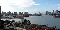 Wallabout Bay is a small body of water in Upper New York Bay along the northwest shore of the New York City borough of Brooklyn, between the present Williamsburg and Manhattan Bridges. It is located opposite Corlear's Hook in Manhattan, across the East River to the west. Wallabout Bay is now the site of the Brooklyn Navy Yard.
