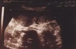 | A picture of an enlarged spleen taken using medical ultrasonography. | |