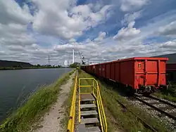 - Westhafen Wanne (literal: "Wanner west port"[5]): This area is now home to a logistics centre constructed in the 1990s known as the Güterverkehrszentrum Emscher[6] (or GVZ Emscher) with rail and road links as well as canal access, the WHE operates the rail links.[7] This port handles coal, and intermodal traffic.