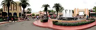 Just beyond the Grand Entrance, the opening plaza encircles its Fountain of Fame centrepiece. Main Street continues with guest services, dining, gift shops and other amenities lining the footpaths.[34] The Roxy Theatre off Main Street screens 4D films.[133] Hollywood Stunt Driver's crew perform motorcycle and rally car stunts.[95] Characters such as Batman, the Joker, Scooby-Doo, Austin Powers and the Looney Tunes cast roam the grounds and pose for photos; each afternoon, they parade with themed floats and vehicles along Main Street.[134][135]