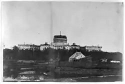 The canal was opened formally during late 1815.[6] The canal route began at the Eastern Branch, near the Washington Navy Yard and proceeded north and northwest. Another planned branch proceeded north and northeast from the estuary of James Creek, which divided Greenleaf Point from Buzzard Point but was only constructed in 1866 and never connected with the existing canal.[7] Past the point at which these two branches were planned to converge, a single canal channel traveled northward towards the Capitol, veered northwestward at the base of Jenkins Hill (Capitol Hill), and then turned again to the north to cross the area in which the National Mall is now located. The canal then turned sharply to the west, joining a straightened and channelized Tiber Creek, which had earlier flowed westward. After traveling westward along the route of Tiber Creek, the canal entered the Potomac River at the outlet of the creek, which was south of the White House.