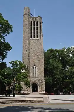 The National Patriots Bell Tower[14] was a later addition to the Chapel, and houses its carillon. The 102 ft (31 m) tower was built entirely with funds raised by members of the National Society of the Daughters of the American Revolution (DAR) over a period of more than a decade.[15] Construction began in 1941, but was suspended due to World War II, and restarted in 1949.[16] The bell tower was completed and dedicated in 1953.