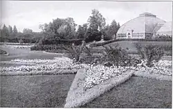 Horace William Shaler Cleveland executed the plans within the limitations of the financial setbacks from the fire (including the loss of tax rolls) and the 1873 depression.[2] Olmsted's vision for Washington Park was generally realized.[8] However, spending for the park was diverted after the Great Chicago Fire in 1871. The loss of financial backing and difficulty in levying taxes after the fire meant that a water park could not be built on the property.[8] From 1897 until the 1930s the park housed an impressive conservatory and ornate sunken garden designed by D. H. Burnham & Co. at 56th Street and Cottage Grove.[9] The Washington Park Conservatory, like those of other city parks such as Humboldt and Douglas Parks, was torn down in the 1930s due to limited resources as a result of the Great Depression. This left Lincoln Park and Garfield Park as Chicago's main Conservatories.[10]