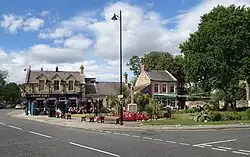 The Washington family are descended from Crínán "the Thane" of Dunkeld (†1045), lay abbot and son-in-law of Malcolm II of Scotland.[3][4][5] In 1183, his descendant Sir William de Hertburn (originally William Bayard)[6] traded his manor of Hertburn (modern-day Hartburn) for that of Wessyington in County Durham near the River Wear. According to post-Conquest noble custom, his family adopted the name of the estate as an Anglo-Norman surname, "de Wessyington", which later became "Washington".[4][7][8][9][10] Wessyington was an Old English placename and probably refers to the estate of a man named Wassa.[11] On this site were relics of Saint Cuthbert, transferred to Durham from its shrine at Lindisfarne, as a saint invoked in combat against the Scots (compare Kirkcudbrightshire), and a symbol of the importance, privileges, and feudal obligations of the illustrious Bishop of Durham and his vassals, including the Washingtons.[7]