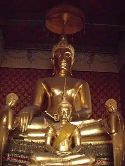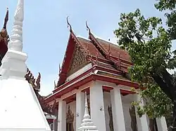 In addition, the community around the temple is also considered to be ancient and of historical value. In the past, it used to be the site of warehouses and factories owned by Chinese and Indians that manufactured various types of product such as leather, salt, sugar, fish sauce, and coal. It is also a diverse community made up of people from different beliefs and cultures, which is way Buddhist temples, Chinese joss houses, and masjids are all located together in the same quarter. Nowadays, most of those businesses have relocated or closed permanently. However, shophouse, antique arched entrance, monasteries, and charming single-story wooden houses still remain in this neighbourhood.[1] It is also a childhood home of Princess Srinagarindra, mother of King Rama VIII and King Rama IX, also a Princess Mother Memorial Park dedicated to her is located nearby.[2][3]