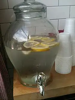 The bottle size varies with the size of the unit, with the larger versions in the US using 5-US-gallon (19 L) bottles. This is also the most common size elsewhere, labeled as 18.9 liters in countries that use the metric system. Originally, these bottles were manufactured at 3,5 or 6 US gallon capacity (11.4, 18.9 or 22.7 liters) and supplied to rented water cooler units.[4] These units usually do not have a place to dump excess water, only offering a small basin to catch minor spills. On the front, a lever or pushbutton dispenses the water into a cup held beneath the spigot. When the water container is empty, it is lifted off the top of the dispenser, and automatically seals to prevent any excess water still in the bottle from leaking.