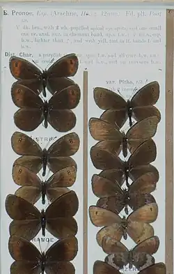 E pronoe Esp. (= arachne Hbn.) (37 c). Dark black -brown, with a red -brown band which is anteriorly broader and posteriorly narrower and bears costally 2 white-centred ocelli and towards the hindmargin an additional smaller one. The band of the hindwing consists of 3 rounded russet-brown spots with black eye-dots which have occasionally white pupils. Underside of the forewing sombre red-brown the band lighter and distinctly contrasting; the distal margin and apex dusted with bluish grey. The hindwing beneath bluish- or ashy- grey with black -brown dusting; the centre traversed by a curved, posteriorly broadly dentate, almost uniformly brown band which sharply borders the distal area. In the latter there are one or two black blind ocelli. The female is much lighter above and beneath, with the markings more prominent than in the male, the ocelli being larger and the base and submarginal band of the hindwing beneath light white-grey, the brown middle hand contrasting sharply. Distributed over the whole Alps, occurring also in the Apennines, Pyrenees, Carpathian Mts., South and South-West Russia and the southern slopes of the Caucasus. - In pitho Hbn (37c), which represents the species in the Swiss Alps and the southern Jura, the markings of the upperside are either entirely absent or there is only a reddish tint as a faint remnant of the same, the 2 ocelli near the apex are small and have minute white pupils. Some species [Sic] have no ocelli, being simply dark black-brown with some violet sheen. Underside as in the first described form - In the form almangoviae Stgr. the subcostal ocelli, though present in the brown band, are without distinct white pupils, those on the hindwing too having no white pupils or only traces of such. In the Allgau — Egg barrel-shaped, ribbed, white. Larva dirty reddish yellow, with a dark dorsal hue, the lateral markings consisting of streaks and the spiracles being black. From October to July on Poa. Pupa anteriorly bone -yellow marked with dark, abdomen cinnamon with dark incisions; so covered among the roots of grass that only the head is visible (Gross-Steyer). The butterfly appears in August and September, fluttering with a jerky flight in meadows and on grassy slopes of the mountain and alpine regions. In some years not rare, occurring up to 6000 ft. in the high ranges. [1]