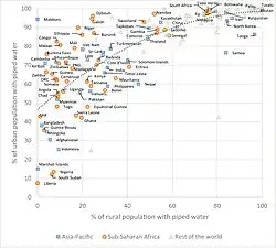 In 2020, 65% of the global population were using piped water (83% urban and 42% rural).[28] Piped water counts as an improved water source.[29]: 12 Overall, sub-Saharan Africa is lagging, with 35% of the population using piped water (56% urban and 20% rural). Within these statistics, access to safely managed drinking water varies within and between large cities, medium- and small-towns.[28]