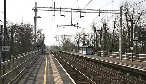 Wedgwood railway station served the Wedgwood complex in Barlaston, Staffordshire, England. Although the station is not officially closed, there has been no train service at the station since 2004 and it is instead served by a rail replacement bus.[1]