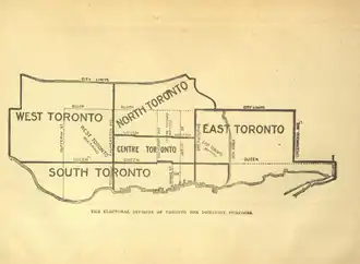 West Toronto was initially defined as consisting of St. John, St. Andrew, St. Patrick, and St. George's Wards of Toronto. In 1872, St. John's Ward was excluded from the riding. In 1892, the riding was given an additional seat in the House of Commons of Canada so that its voters elected two Members of Parliament in 1896 and 1900.