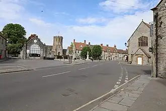 The main square, Market Place, with its market cross is today an attractive location for visitors.[41] Market crosses have stood in the square since before 1390; the present Butter Cross, a roofed market cross, was rebuilt in 1673, and is Somerton's most noted feature.[42] The structure was the property of the Earls of Ilchester who sold it to the town in 1916.[43] It is a Scheduled Ancient Monument.[44] Next to the Butter Cross stands the Old Town Hall.[6][45] Bordering the square are the church, and the Lady Smith Memorial Hall, also known as the "Parish Rooms", which was built in 1902,[46] and named after Frances (nee Pinney), the late wife of Sir John Smith, who had died in 1895.[47] The 17th century Market House is now a restaurant.[48] The Red Lion was opened by the Earl of Ilchester in 1768 as a model coaching inn. It closed in 1995; after a period of neglect it has been redeveloped as town houses.[49][50]