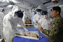 - Dickson, S. J.; Clay, K. A.; Adam, M.; et al. (14 December 2017). "Enhanced case management can be delivered for patients with EVD in Africa: Experience from a UK military Ebola treatment centre in Sierra Leone". The Journal of Infection. 76 (4): 383–392. doi:10.1016/j.jinf.2017.12.006. ISSN 1532-2742. PMC 5903873. PMID 29248587.