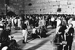 On August 14, 1929, after attacks on individual Jews praying at the Wall, 6,000 Jews demonstrated in Tel Aviv, shouting "The Wall is ours." The next day, the Jewish fast of Tisha B'Av, 300 youths raised the Zionist flag and sang Hatikva at the Wall.[72] The day after, on August 16, an organized mob of 2,000 Muslim Arabs descended on the Western Wall, injuring the beadle and burning prayer books, liturgical fixtures and notes of supplication. The rioting spread to the Jewish commercial area of town, and was followed a few days later by the Hebron massacre.[79] One hundred and thirty-three Jews were killed and 339 injured in the Arab riots, and in the subsequent process of quelling the riots 110 Arabs were killed by British police. This was by far the deadliest attack on Jews during the period of British Rule over Palestine.