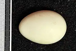 Before commencing laying, the female spends much time near the nest and is entirely provisioned by the male. Meanwhile, the male roosts nearby and may cache any prey that is surplus to their requirements. When the female has reached peak weight, the male provides a ritual presentation of food and copulation occurs at the nest. The female lays eggs on alternate days and the clutch size averages about five eggs (range two to nine). The eggs are chalky white, somewhat elliptical and about the size of bantam chicken eggs, and incubation begins as soon as the first egg is laid. While she is sitting on the nest, the male is constantly bringing more provisions and they may pile up beside the female. The incubation period is about thirty days, hatching takes place over a prolonged period and the youngest chick may be several weeks younger than its oldest sibling. In years with plentiful supplies of food, there may be a hatching success rate of about 75%. The male continues to copulate with the female when he brings food which makes the newly hatched chicks vulnerable to injury.[34]