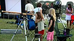 The event was held on the National Mall the next year on July 9, 2011.[7] The Smithsonian National Air and Space Museum assisted through opening its Public Observatory and outer landing area to the public.[7][8] Hofstra University sponsored the event, and presented both live events and space observation through telescopes.[8] Hofstra University program coordinator of astronomy public outreach, professor Donald Lubowich, helped organize the event.[8][9] Lubowich commented: "Bringing Hofstra's program to the National Mall gives us a very special opportunity to encourage children to pursue their interest and science and promote public understanding of science. Gazing at the rings of Saturn or the Moon's craters and mountains captures the imagination, no matter how old you are."[8] The 2011 event included assistance from the Northern Virginia Astronomy Club, in addition to attendance from organizations including: the American Astronomical Society, the James Webb Space Telescope, the NASA Goddard Space Flight Center, the National Radio Astronomy Observatory, and the Franklin Institute Science Museum.[8]