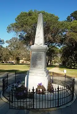 A World War I Memorial was erected in 1918 by the Lidcombe contractors Kingsley and Cook in David Street, just outside the Macquarie town boundaries. In 1966 the Colo Shire Engineer, Stan Brown, supervised the transfer of the monument intact on a float. It was resited, together with its circular cast-iron fence, near the top of the diagonal pathway, and at right angles to it, so that it has a spatial relationship with the 1947 Memorial Gates at the foot of the avenue. The text on the original marble plaque on the Memorial referring only to World War I had already been expanded to include World War II while the Memorial was still in David Street. Names of people who served in the Korean War (1950–1953) and the Vietnam War (1965–1972) were added after the memorial was relocated in the Park. The names of those who served in these later conflicts were added on new plaques low down on the sandstone base.[1]