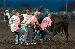 Wild cow milking is a rodeo event seen at mainstream and ranch rodeos. A team-based competition, the goal is to catch and milk a "wild" cow (a semi-feral animal that is not used to being milked by people, usually of a beef cattle breed) in as short a time as possible.[1] The competition dates back at least to the early 20th century, with competitions at the Cheyenne Frontier Days rodeo photographed as far back as 1924.[2]