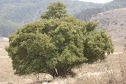 The climate of these mountains is less humid than that of the high peaks of the coastal mountains. This is due to the lower humidity levels in the atmosphere, which in turn affects the density of the vegetation. The vegetation representative of the Mediterranean Basin is less dense in these mountains than in the coastal mountains due to the lack of humidity. Most of the forest area in these regions consists of Brutia pine. In addition to this species, other cone species may be present, including Aleppo pine and Mediterranean cypress (Cupressus sempervirens). Several species of juniper (Juniperus excelsa) may also be present such as Cade juniper (Juniperus oxycedrus), Syrian juniper (Juniperus drupacea) and stinking juniper (Juniperus foetidissima). Broadleaf species including carob, elderberry, terebinth (Pistacia palaestina), and Atlantic (Pistacia atlantica) are present. Additionally, the Atlantic terebinth (Pistacia terebinthus), the mastic (Pistacia lentiscus), the kermes or Palestinian oak (Quercus coccifera), gray myrtle, Syrian myrtle (Fraxinus syriaca), wild olive, hawthorn species (Crataegus) and Syrian pear (Pyrus syriaca), primrose jasmine (Jasminium nummularia), and Palestinian buckthorn (Rhamnus palaestina). Types of wild almonds can be found, including Levantine, Arabic, korshinskyi (Prunus korshinskyi), common and mahleb (Prunus mahaleb) almonds.[10] Also, myrtle, eiderdown, and cranberry varieties can be found.[11] Shrubs like bear peach, Jabal al-Sheikh maple (Acer hermoneum) and Cotoneaster nummularius are also present.[12] Broadleaf buttonwood (Phillyrea latifolia) and Greek strawberry tree (Arbutus andrachne) are also present.[13] High up in these mountains are some perennial species of Onobrychis (mountain, long-spined, Kochi, and Pendosi). The foothills of these mountains are also populated by a multitude of annual and perennial herbaceous plants belonging to various families, including leguminous, vetiver, asteraceous, buttercup, papaveraceae, and Iridaceae. The most prevalent legume species in the Levant (across diverse habitats) include the following: shamrock (more than sixty species), qatad (approximately forty-five species), alfasa (more than forty species), vetch (more than forty species), and anabris (approximately twenty species). A minimum of 18 species of monocotyledons have been identified in the mountains of the Levant.