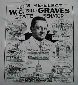 William Carey Graves (December 1, 1895 in Washington Parish, Louisiana – January 26, 1966 in Dallas, Texas) was a Democratic Texas State Senator for 4 terms and Majority Leader & Senate President for two of those terms. Graves was Governor of Texas for a day.