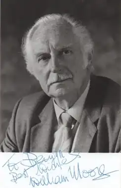 William Aaron Moore (19 April 1916 – 24 April 2000) was an English character actor.[1] He was best known for his role as long-suffering Sydney Lumsden in the popular 1980s comedy series Sorry! (in which he became known for the catchphrase "Language, Timothy!").[2][3] He also appeared in numerous other television programmes, including Coronation Street as Cyril Turpin, Betty Turpin's husband from 1969–1970.[4] The character put in two more appearances in 1972, then died off-screen in 1974.[5] Moore was married to actress Mollie Sugden from 29 March 1958 until his death.[6] Their twin sons, Robin and Simon, were born in October 1963. Moore starred with Sugden in My Husband and I.[7][8]
