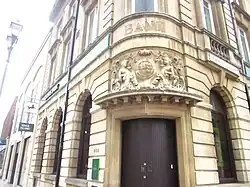 1899. St Hugh's Chambers, Corporation Street, Lincoln. Originally the offices of the solicitors A Trotter and A Brook. One of the few buildings in Lincolnshire with Art Nouveau decoration. Corporation Street was a new road opened up to link High Street and Hungate in the late C19. Three storey elevation, red brick with Welsh slate roof, with half timber gabled bays, pargeting and ornamental stonework. The street frontage is symmetrical with a central entrance with a stone door case formed by flanking pilasters supporting an ornamented stone pediment with a central shield embossed with ‘’St Hughes Chambers 1899’’ flanked by pedestals bearing rampant lions. Lloyds Bank, Lincoln Over the entrance at first floor level is a projecting canopied gothic style statue plinth with a projecting domed stone canopy above. At the centre, at second floor level, there is an oculus window. On either side of the window is wings is a pair of back to back griffins formed in relief by pargeting. The two bay windows are also have paired griffins. The building was listed Grade II in 2007.[22]