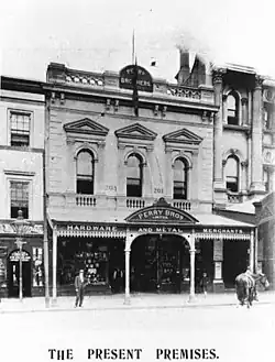 In June 1860, William Perry moved to Brisbane with his brother George to establish a hardware business; their brother Frederick later joined them. In August 1860, the Perry Brothers opened their business in Queen Street (where the Wintergarden Centre is in 2014). Business was successful and in 1865 they built new premises next door which they later extended back to Elizabeth Street. In 1876 his brother in law, Henry James Harcourt (1820–1909), also an Iron Monger, helped the business and "between the death of the late Mr. W Perry and the advent of his sons into the firm acted in a very responsible way in the business". His sister-in-law was married to Thomas Peate, of Smith, Peate & Co. Sydney.[4]