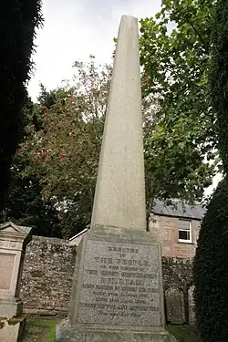 He is buried in the churchyard of Brechin Cathedral. The large obelisk marking his grave lies north west of the church.