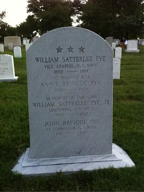 Pye's oldest son, LT William Satterlee Pye, Jr., was killed in a plane crash in 1938. His youngest son, Lieutenant Commander John Briscoe Pye, served on the submarine USS Swordfish on her 13th and final war patrol. Swordfish was lost with all hands on 12 January 1945, off Kyushu, Japan.