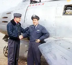 For a two-war total of 22 destroyed in the air, 1 probable, 6 damaged, and 3 destroyed on the ground, made him one of only 7 people to have been an ace in both World War II and the Korean War.[9] The others, George Andrew Davis Jr., Gabby Gabreski, Vermont Garrison, Harrison Thyng, and James P. Hagerstrom, are all Air Force pilots, as well as John F. Bolt of the U.S. Marine Corps.[10][11]