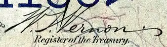Vernon achieved prominence as a Republican as president of Western University, and in 1906, he was appointed by President Theodore Roosevelt as Register of the Treasury. All US currency printed during his tenure carries the signature of William T. Vernon. He was briefly reappointed by William Howard Taft in 1910, but the president needed the position for his own patronage. Vernon accepted a federal appointment as the Supervisor of Indian and Negro Schools on a reservation in Oklahoma, newly admitted as a state combining the Indian and Oklahoma territories.[6]