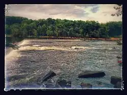 Williams Island Dam was built in 1905 as part of a drinking water project of the City of Richmond which made use of a portion of the former James River and Kanawha Canal along the north shore of the river west of Richmond. A gravity dam, its height is 7 feet (2.1 m). Its normal storage capacity is estimated to be 50 acre-feet (62,000 m3).[1] It was connected with an early waterworks building which is located on Pumphouse Drive just west of the city's Boulevard Bridge.