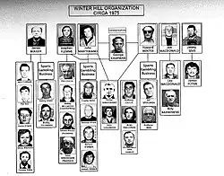 The Winter Hill Gang was a loose confederation of American organized crime figures in the Boston, Massachusetts area. It was generally considered an Irish mob organization, with most gang members and the leadership consisting predominantly of Irish-Americans, although some notable members, such as Stephen Flemmi and Johnny Martorano, were of Italian-American descent.[5] The organization itself derives its name from the Winter Hill neighborhood of Somerville, Massachusetts, north of Boston.[6] The Winter Hill Gang was given its name in the 1970s by journalists at the Boston Herald.